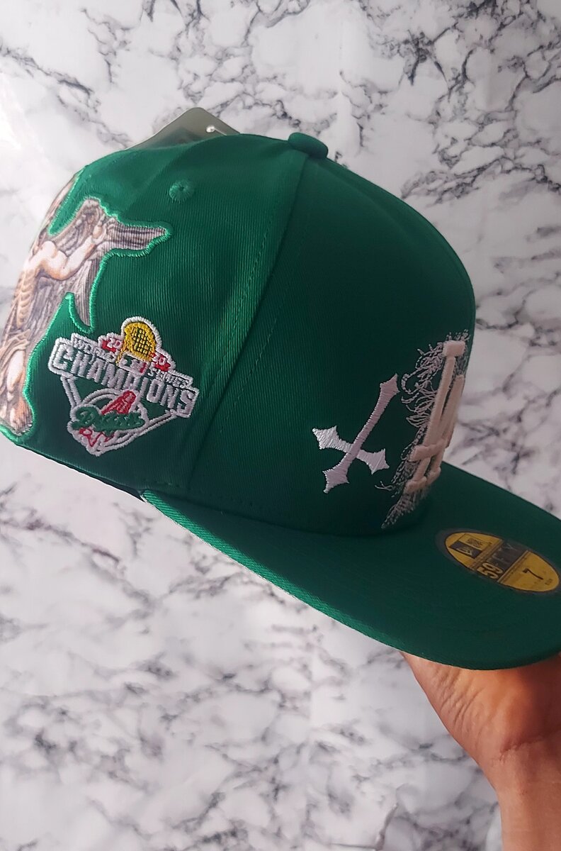 Optez pour cette casquette snapback verte au design urbain unique, orné de motifs brodés. Idéale pour ajouter une touche de style à vos tenues décontractées. Parfaite pour les fans de mode streetwear.