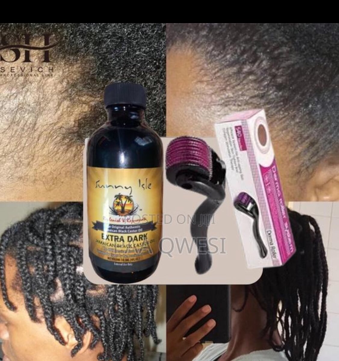 Jamaica Castor oil- Hair Growth, Thickening, Hair Repair, Hair Repair, Hair Growth, Shine, Thickening, Shine, Moisturizing, Moisturizing. Derma roller-- Efficient system for anti-aging skin, Regeneration skin tightening, and Collagen stimulation therapy minoxidil contains active ingredients to boost hair growth naturally. Derma Roller stimulates hair growth, improves thinning/balding hair area.