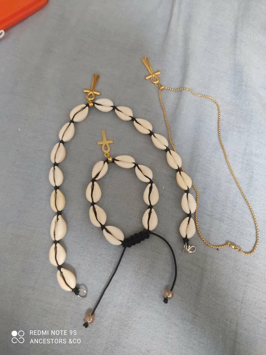 1 ensemble cauris + bracelet 1 chanche ankh dorée