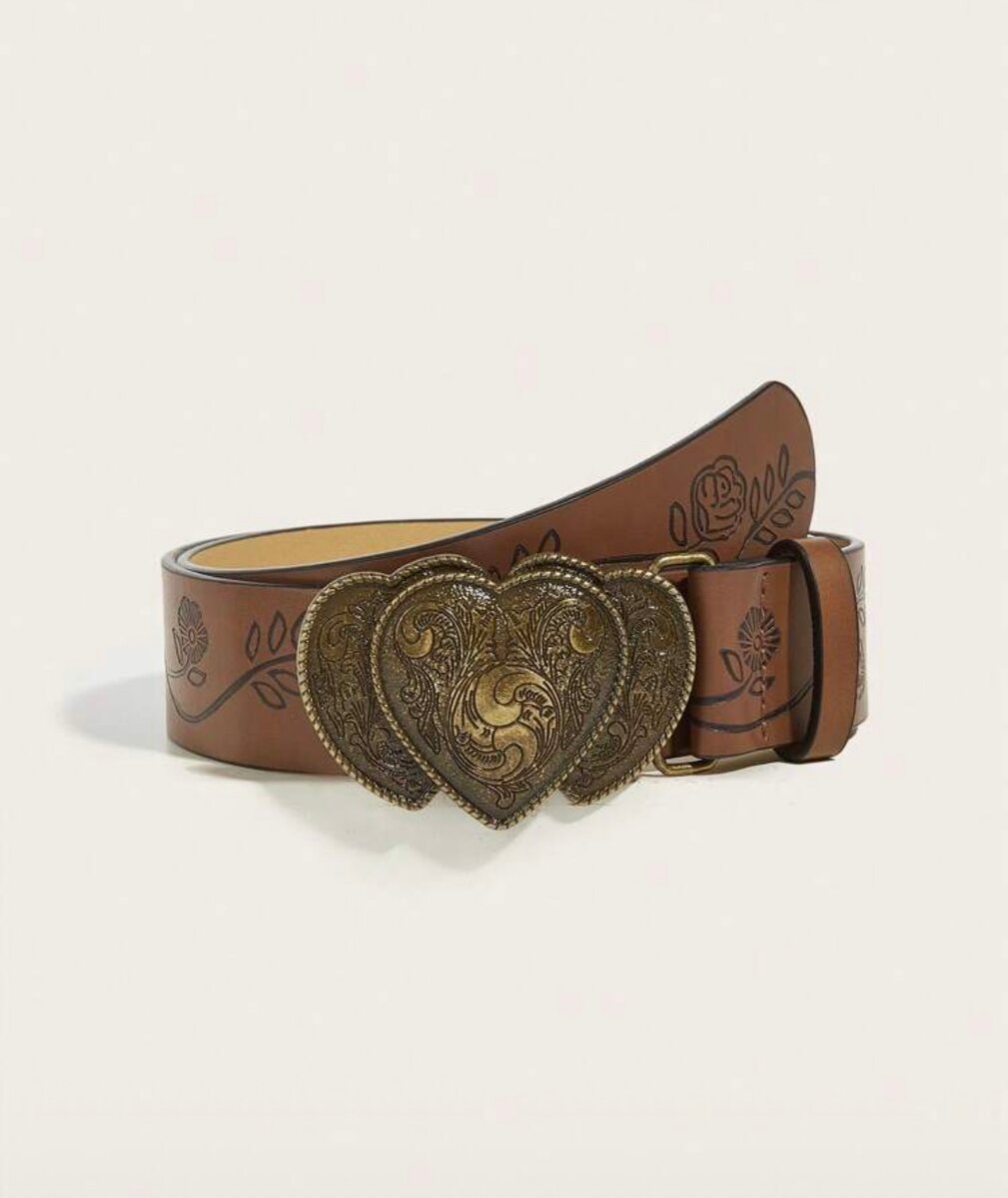Ceinture en cuir ornée d'une élégante boucle en forme de cœur gravée. Parfaite pour ajouter une touche romantique à votre tenue. Idéale pour un usage quotidien ou des occasions spéciales.