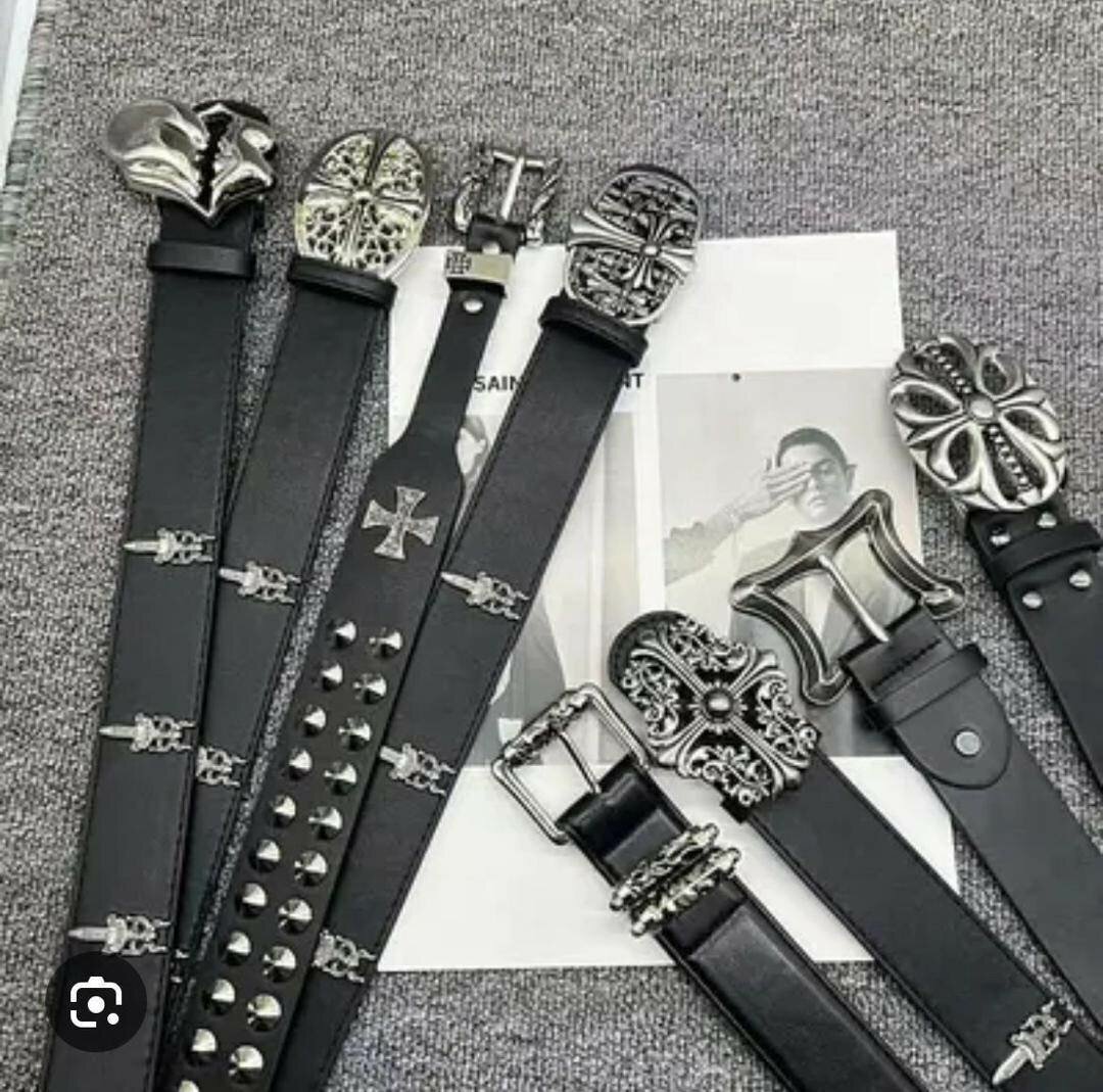 Ceinture en cuir avec boucles décoratives et motifs uniques. Idéale pour ajouter une touche gothique à n'importe quelle tenue. Parfait pour les amateurs de mode alternative et rock.