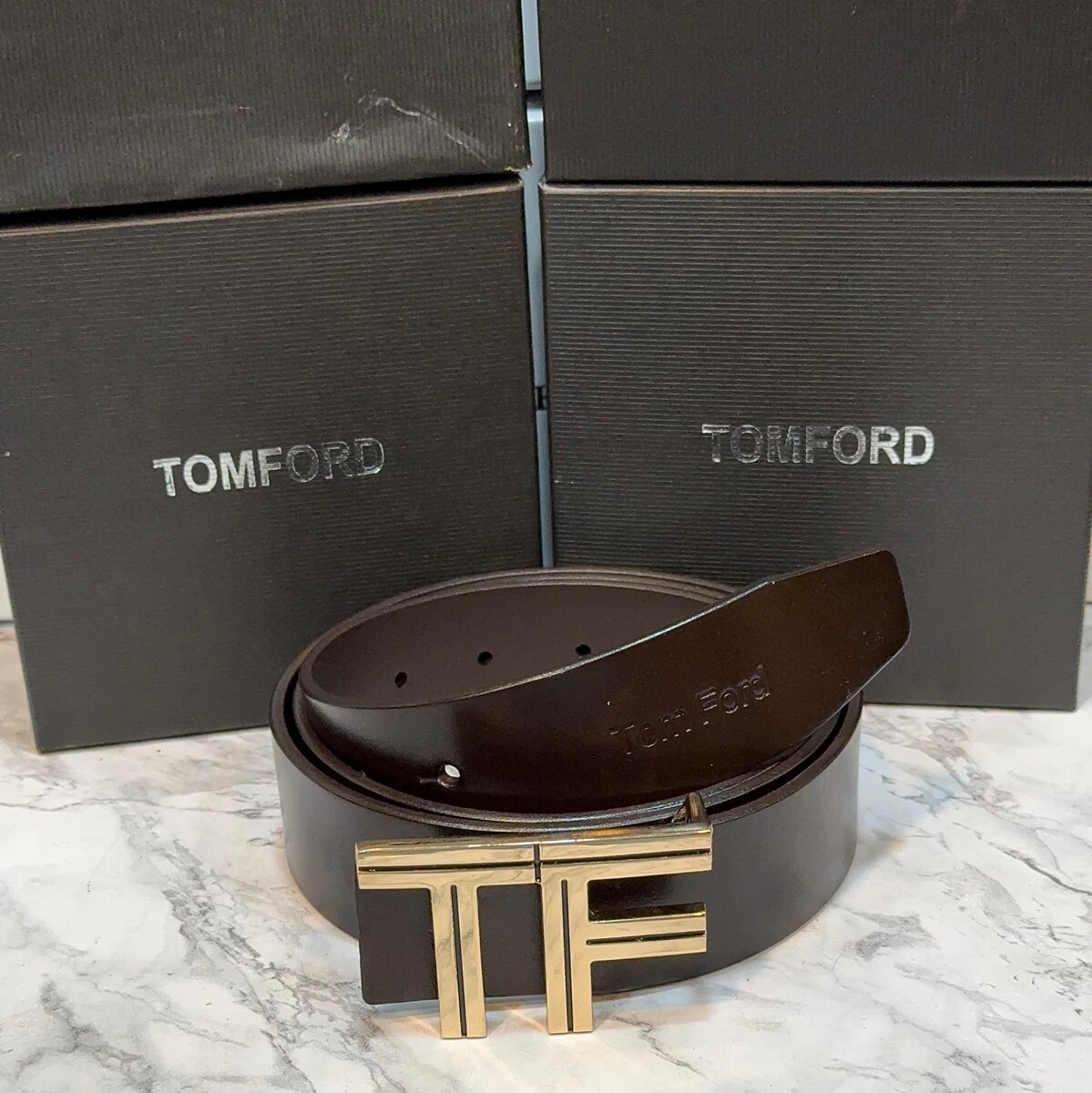 Ajoutez une touche de luxe à votre tenue avec cette élégante ceinture en cuir de Tom Ford. Dotée d'une boucle dorée distinctive 'TF', elle est parfaite pour un look sophistiqué et moderne. Idéale pour les événements formels ou une utilisation quotidienne, cette ceinture combine style et fonctionnalité.