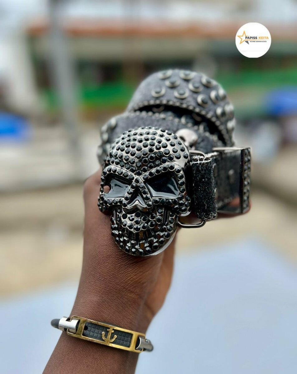 Ceinture unique avec boucle tête de mort étincelante. Parfait pour ajouter une touche audacieuse à vos tenues. Idéal pour les amateurs de mode rock et punk.