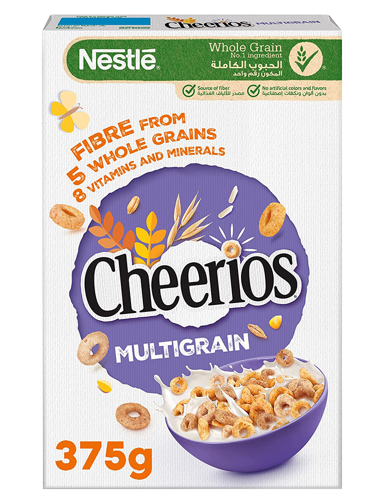 Découvrez les céréales Cheerios Multigrain de Nestlé, riches en fibres grâce à 5 grains complets. Idéales pour un petit-déjeuner nutritif, elles apportent vitamines et minéraux essentiels pour bien démarrer votre journée.