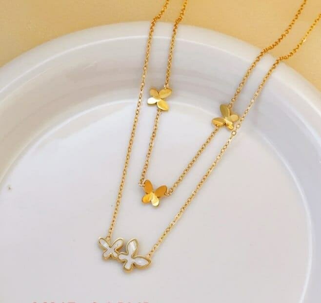 Elegant butterfly-themed layered necklace in gold, perfect for adding a touch of whimsy and elegance to any outfit. Ideal for fashion-forward individuals seeking a stylish statement piece.