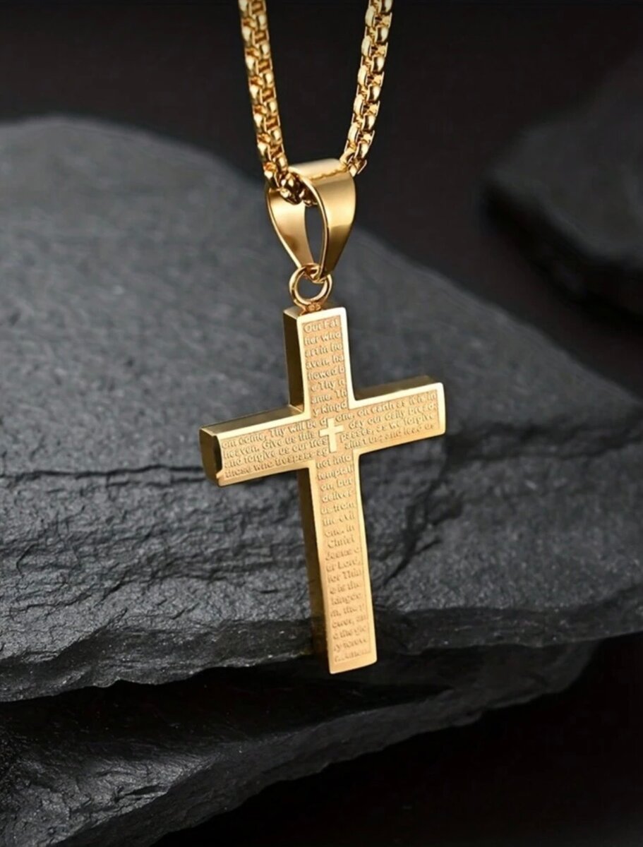 Porte ta foi avec fierté et style. Cette croix dorée unique est finement gravée de paroles spirituelles, symbole de protection et de paix intérieure.