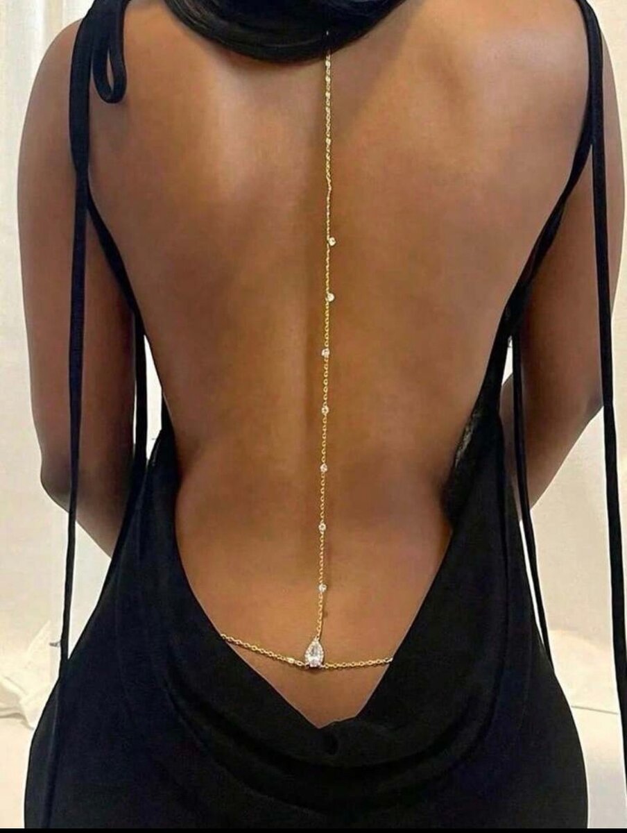 Elevate your style with this elegant gold back necklace. Featuring a stunning pear-cut pendant and delicate chain design, it's perfect for special occasions or adding a glamorous touch to your evening wear. A must-have accessory for any fashion-forward wardrobe.