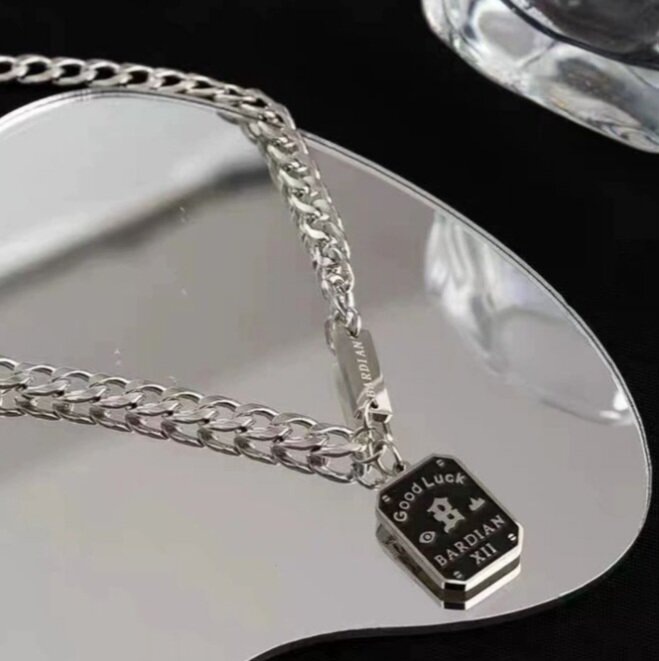 Optez pour cette chaîne masculine avec plaque argentée ornée de motifs modernes. Conçue pour ajouter une touche sophistiquée, elle s'accorde parfaitement avec toute tenue. Idéale pour les événements ou un usage quotidien, elle fera ressortir votre style tout en restant élégante.