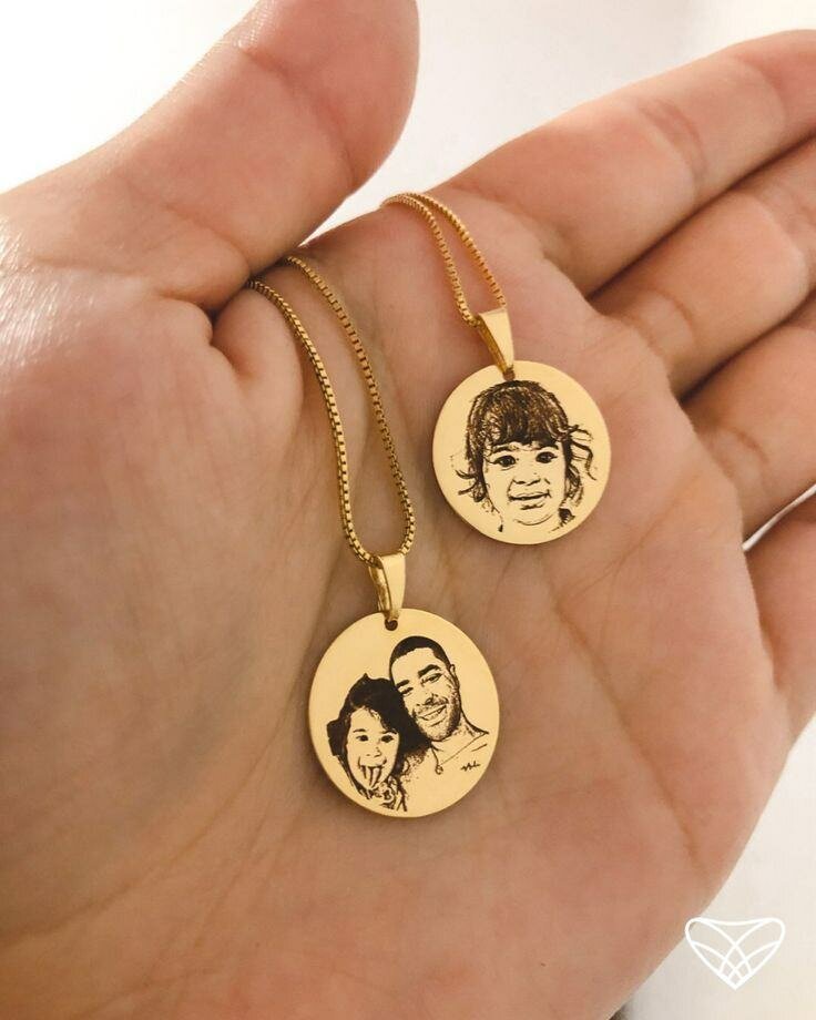 Colliers personnalisés en acier inoxydable doré avec photo gravée et prénom. Un bijou unique et significatif, parfait pour offrir ou garder en souvenir dun être cher. Gravure durable et finition brillante.