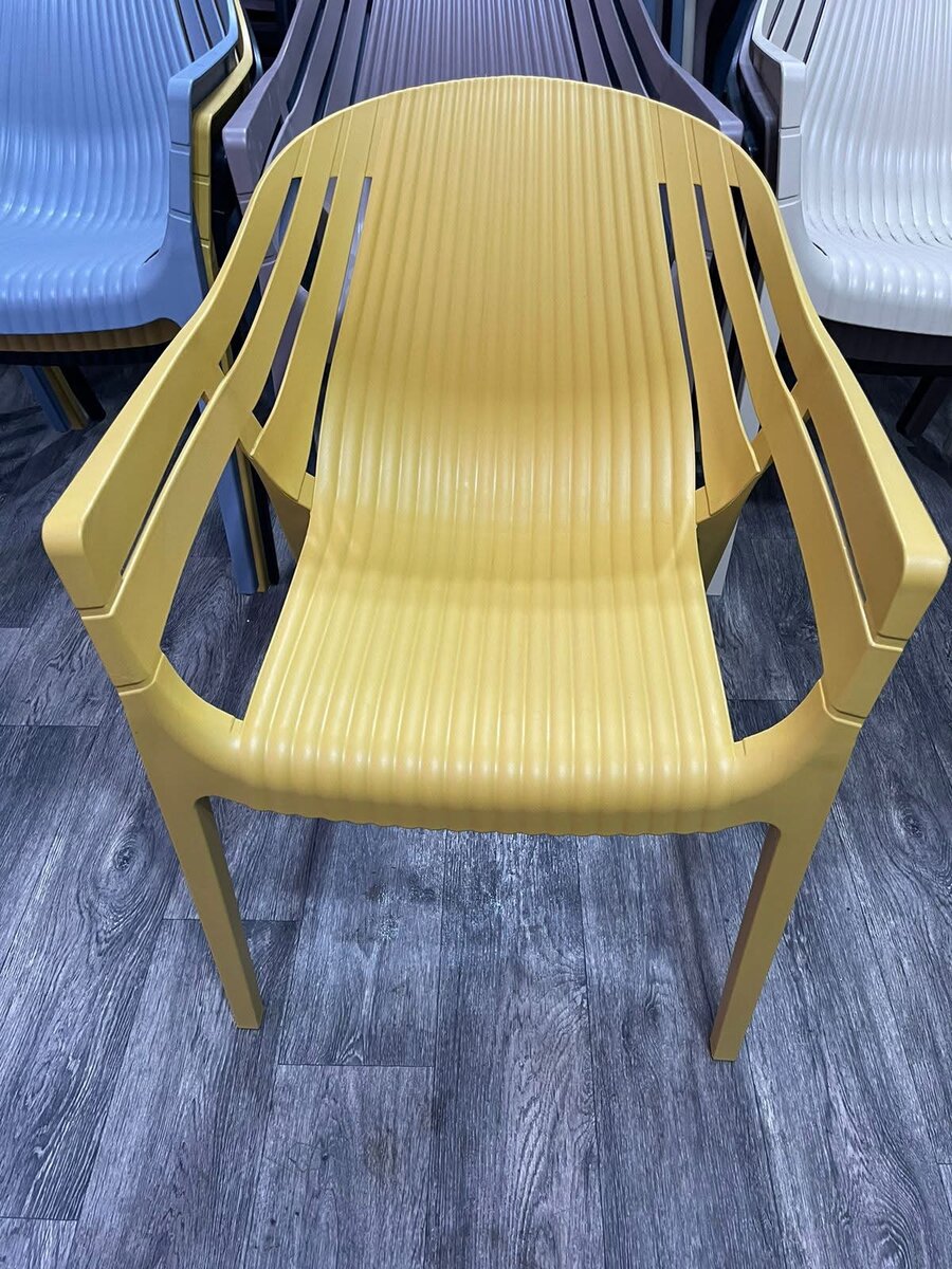 Chaise moderne en plastique jaune pour intérieur ou extérieur. Design élégant et durable. Facile à nettoyer et résistante aux intempéries. Parfait pour salle à manger, terrasse ou jardin.