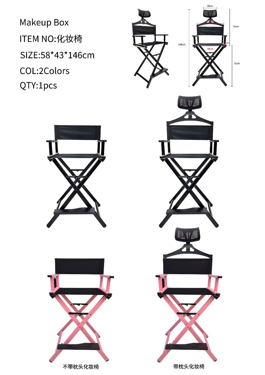 Chaise de maquillage pliante avec dossier confortable, idéale pour les professionnels. Légère et portable, disponible couleurs noir élégantes. Parfaite pour les studios ou en déplacement.