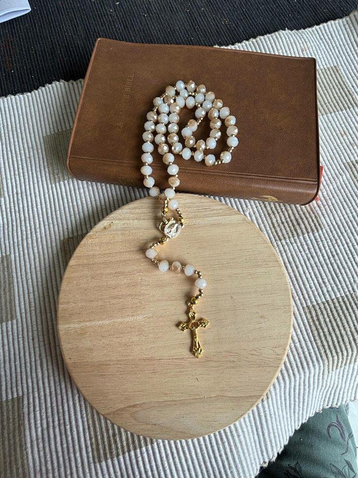 Découvrez ce magnifique chapelet en perles blanches avec des détails dorés. Parfait pour la prière quotidienne et comme cadeau symbolique. Ses perles lisses et éclatantes ajoutent une touche de spiritualité et d'élégance.