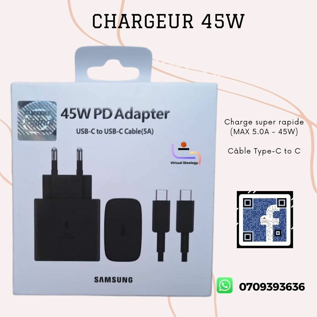 Chargeur type-C pour vos appareils compatibles (Samsung, Xiaomi, Tecno, Infinix,...) avec la charge 45W. Ultra rapide.