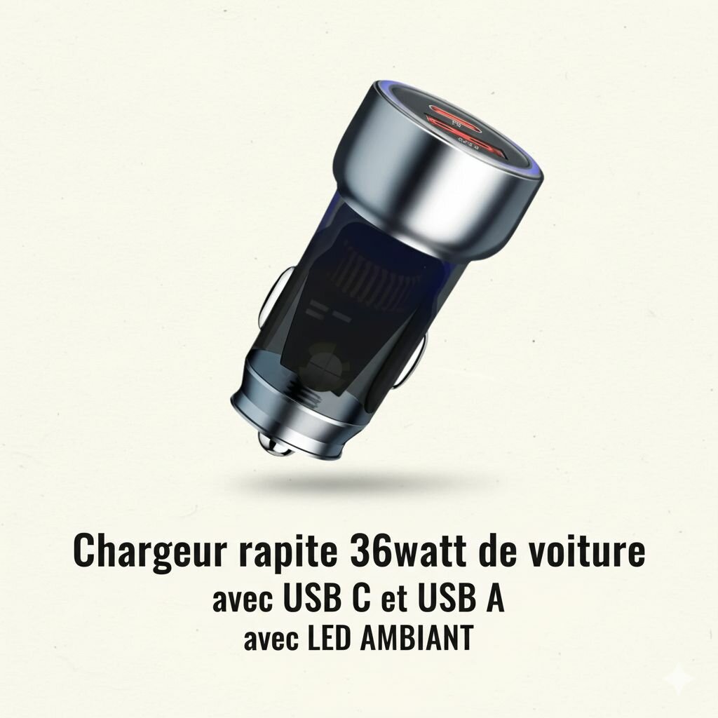 Chargez efficacement vos appareils avec ce chargeur voiture 36W, doté de doubles ports USB C et USB A. Design compact avec éclairage LED ambiant, idéal pour tous vos trajets. Compatible avec smartphones, tablettes et plus encore. Un compagnon parfait pour vos voyages.