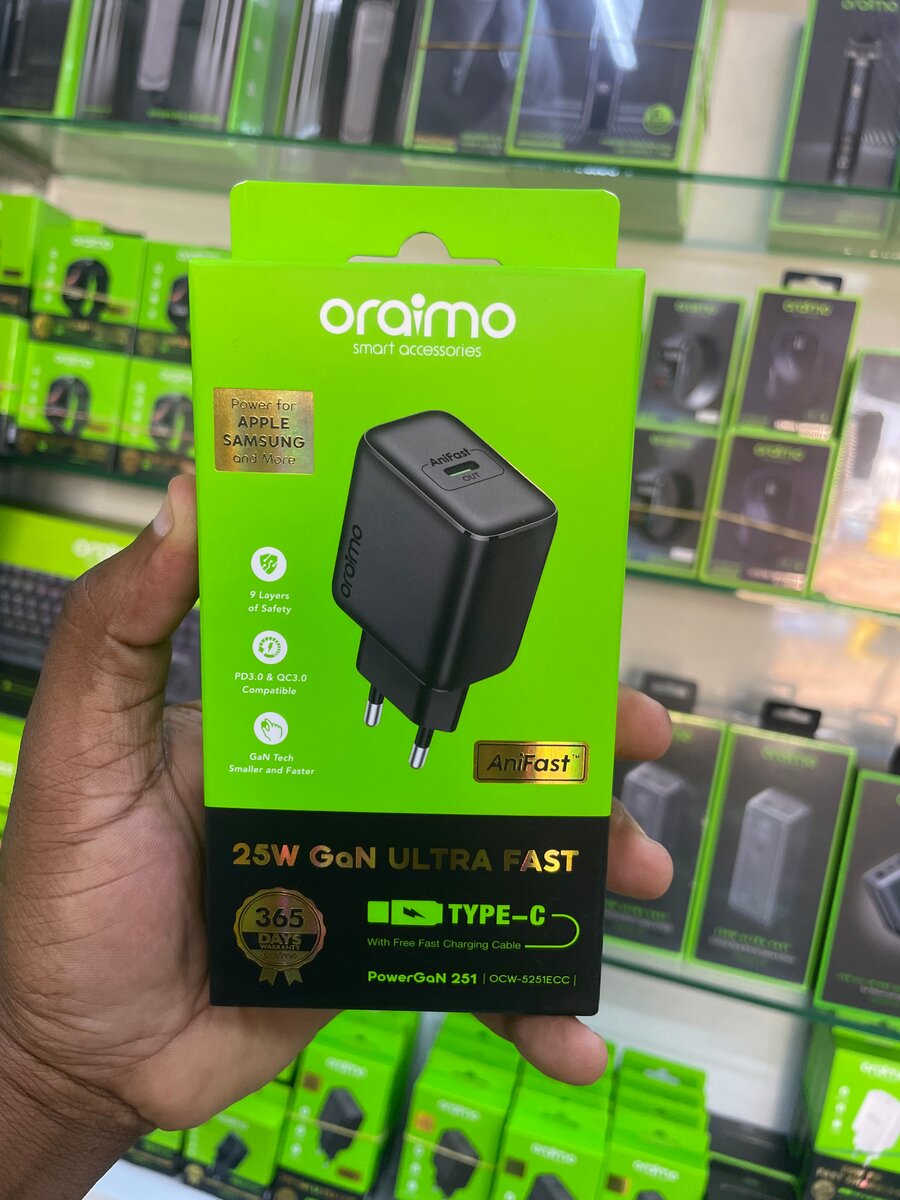 Chargez vos appareils rapidement avec le chargeur Oraimo 25W GaN. Compatible USB-C, idéal pour Apple et Samsung.