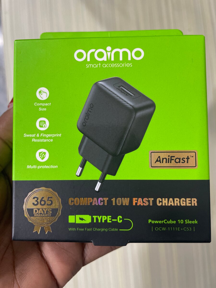 Profitez d'une charge ultra-rapide avec le chargeur Oraimo 10W. Compact et résistant aux traces, il offre une protection multi-level et inclut un câble Type-C de 1m. Idéal pour voyages!