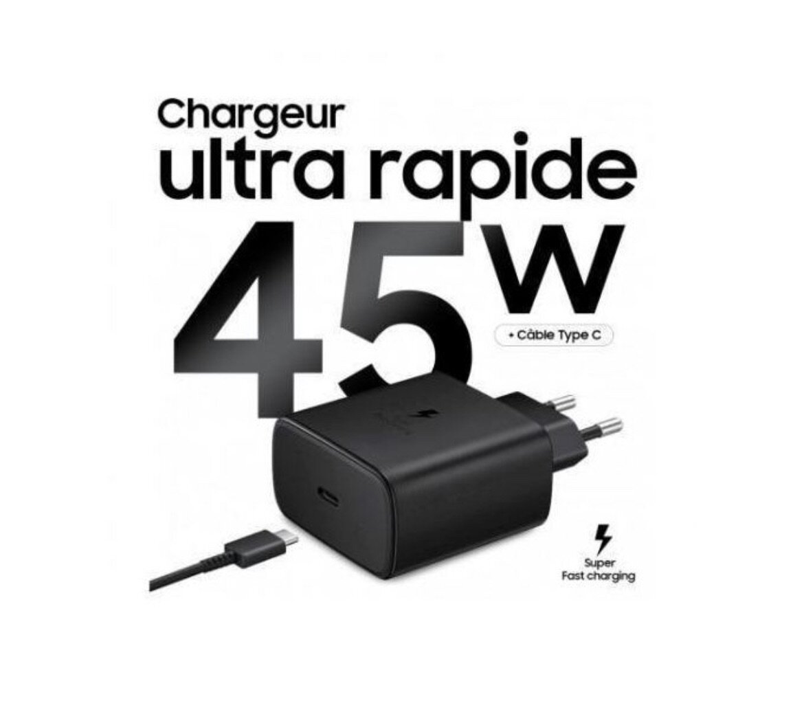 Profitez de la charge ultra rapide avec ce chargeur Samsung 45W USB-C. Conçu pour des performances optimales, il est idéal pour vos appareils compatibles. Compact et efficace, il assure une recharge rapide et sécurisée. Parfait pour une utilisation quotidienne à la maison ou en déplacement.