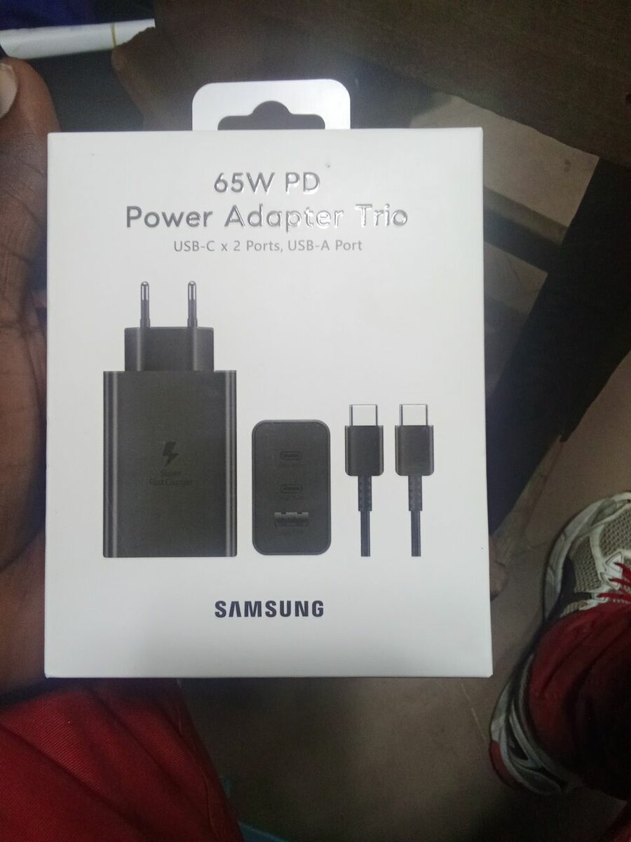 Chargeur Samsung 65W Power Adapter Trio avec ports USB-C et USB-A. Conçu pour une recharge rapide et efficace de vos appareils. Idéal pour les déplacements et compatible avec plusieurs appareils Samsung et autres.
