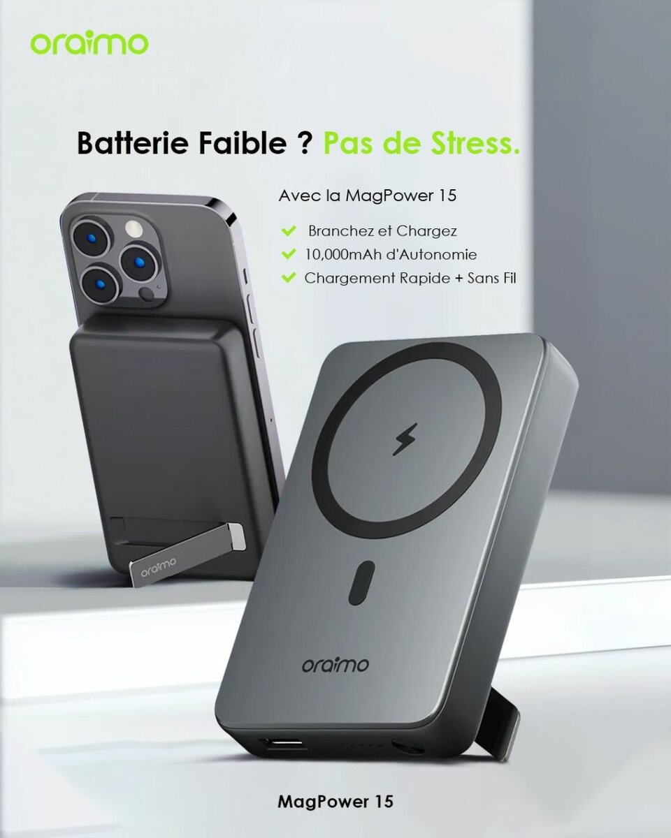 Découvrez le chargeur sans fil Oraimo MagPower 15 avec une capacité impressionnante de 10,000mAh. Rechargez vos appareils facilement grâce à sa technologie rapide et sans fil idéale pour vos déplacements. Design moderne et portable.