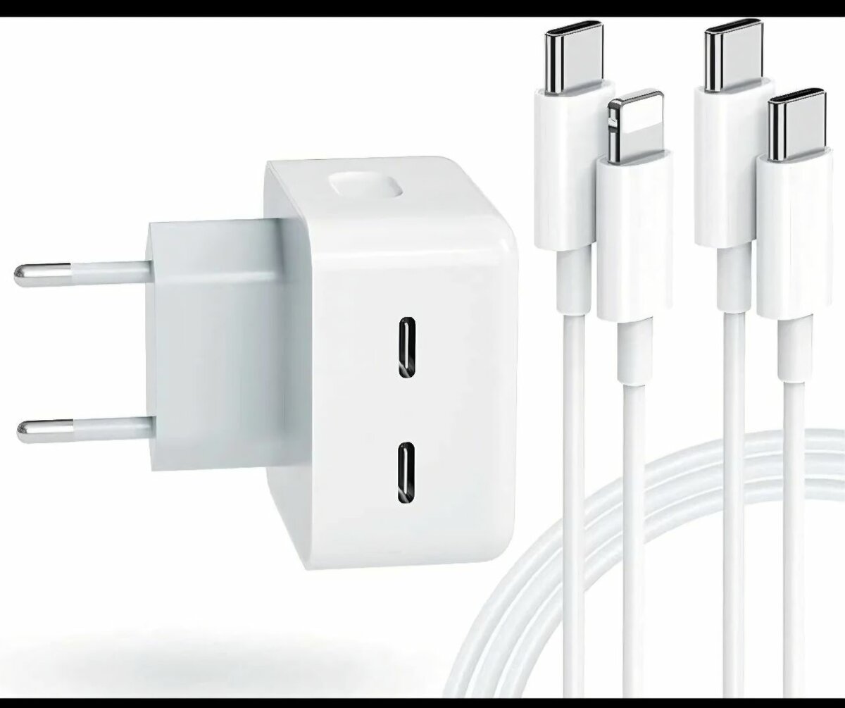 Chargeur rapide USB Type-C avec double port et câbles inclus. Idéal pour smartphones et appareils USB-C, offrant une recharge efficace et sécurisée. Compact et portable, parfait pour la maison ou les voyages.