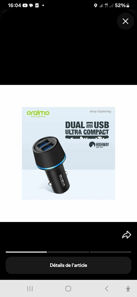 Profitez d'une recharge rapide en route avec le chargeur USB voiture Oraimo. Compact et puissant, il offre deux ports pour alimenter simultanément vos appareils. Idéal pour les trajets quotidiens ou les longs voyages, ce chargeur garantit une connectivité continue. Compatible avec tous les appareils USB, sa conception robuste s'adapte à chaque utilisation.