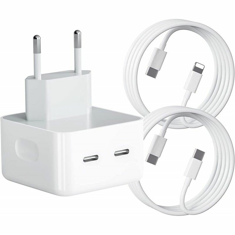 Optez pour ce chargeur puissant de 50W avec double port USB-C pour une charge rapide. Parfait pour iPhone 14 Pro Max et autres appareils compatibles. Inclut câble USB-C vers Lightning. Idéal pour la maison ou le bureau.
