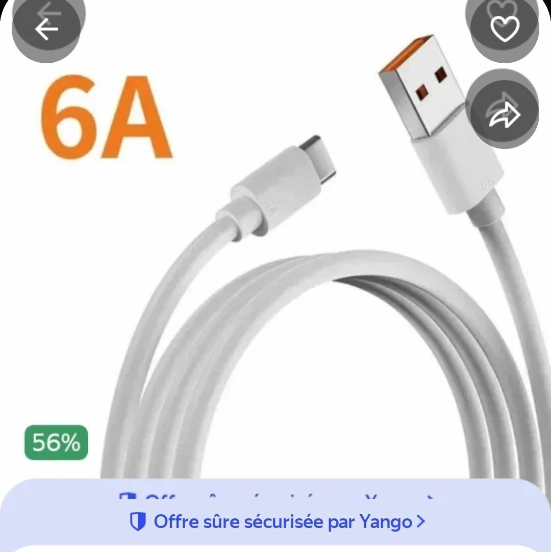 Câble USB-C rapide de 6A pour une charge efficace. Compatible avec divers appareils pour une performance optimale. Idéal pour smartphone et tablette.