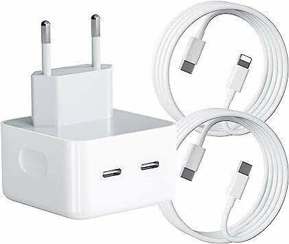Chargeur USB-C double port avec câbles inclus. Parfait pour smartphones et tablettes. Charge rapide et efficace, idéal pour la maison ou le bureau.