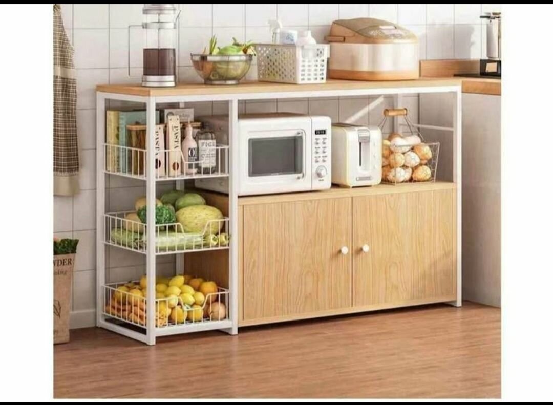 Optimisez votre cuisine avec cet étagère multifonction en bois. Rangements spacieux pour micro-ondes, grille-pains et légumes. Idéal pour une organisation pratique et moderne.