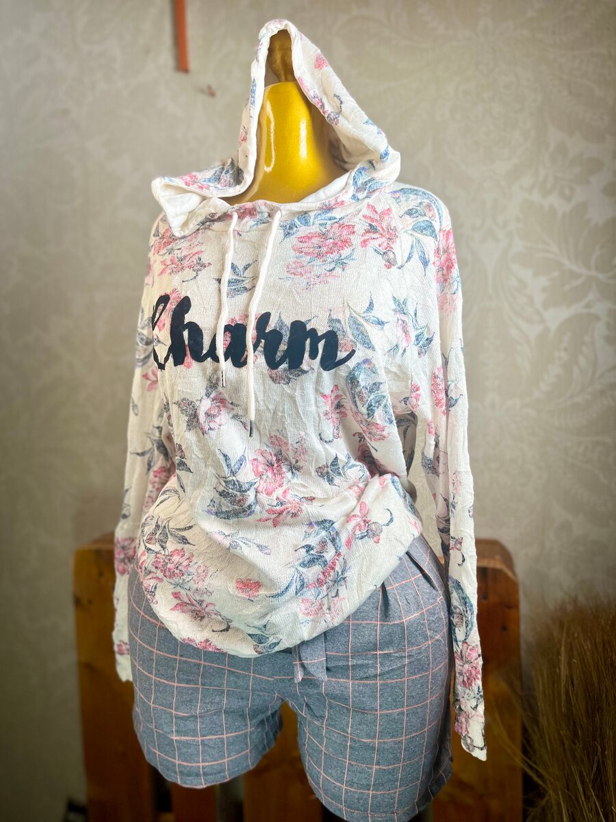 Ensemble féminin élégant avec hoodie floral 'Charm' et short à carreaux. Confort idéal pour des journées décontractées ou à la maison. Disponible en plusieurs couleurs pour varier votre style.
