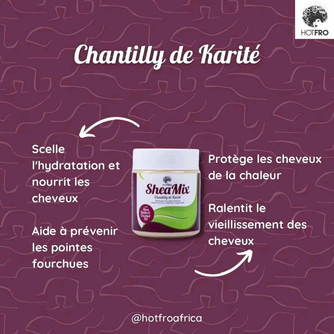 Notre Chantilly au beurre de Karité nourrit les cheveux en profondeur accompagné de son odeur 🤩🤩.Il laisse les cheveux brillants et agréablement parfumés . Il donne de l'éclat aux cheveux, idéal pour des cheveux naturels et frisés.
