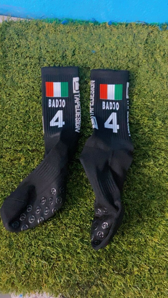 Chaussettes de sport Badjo avec grips pour une adhérence optimale. Parfaites pour le football ou le basketball. Disponibles en blanc et noir. Confort et performance garantis pour tous les athlètes !