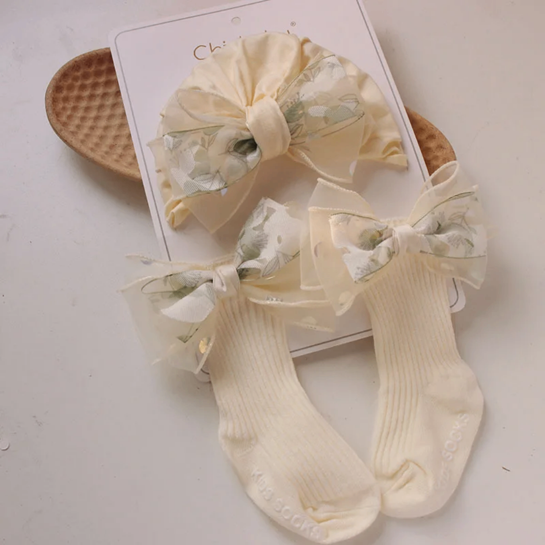 Adoptez un look adorable et élégant pour votre bébé avec ces chaussettes et bandeau assortis. Idéal pour les occasions spéciales ou une tenue quotidienne chic. Confortables et stylées, ces chaussettes en coton doux sont agrémentées de jolis nœuds qui ajoutent une touche raffinée. Parfaites pour compléter une tenue de cérémonie ou pour offrir en cadeau.