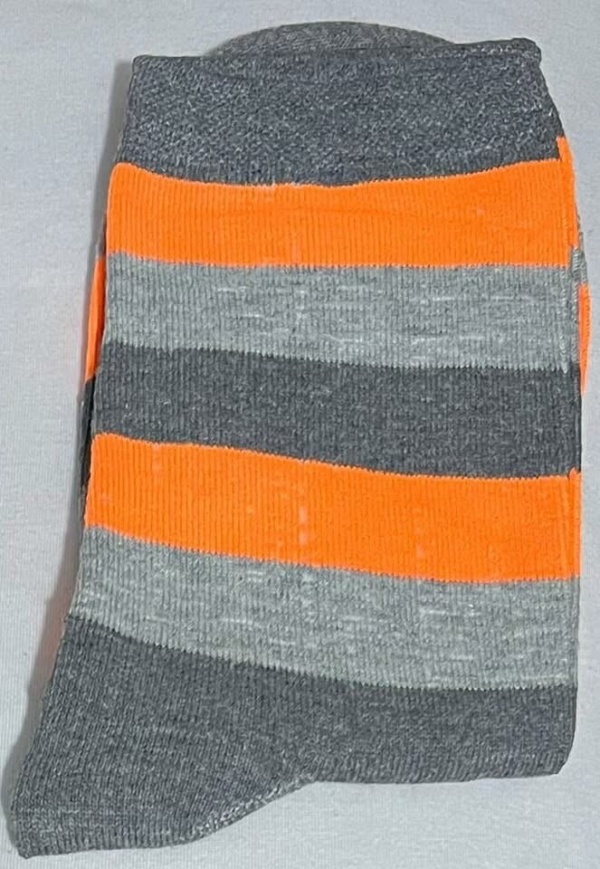 Ajoutez une touche de couleur à votre tenue avec ces chaussettes rayées modernes en orange et gris. Confortables et élégantes, elles sont idéales pour un look décontracté ou professionnel.