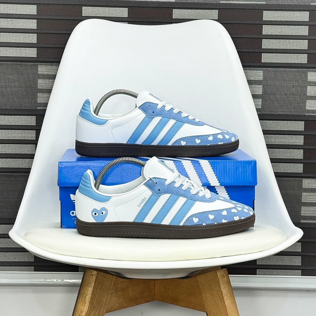 Découvrez les Adidas Samba revisitée avec un motif cœur bleu et blanc. Parfaites pour ajouter une touche de style unique à votre tenue quotidienne. Confortables et stylées, elles sont idéales pour les sorties en ville ou les occasions décontractées.