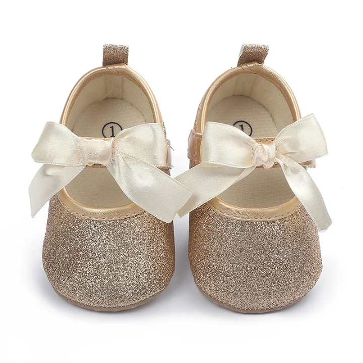 Chaussons élégants pour bébés avec paillettes dorées et doux nœuds satinés. Parfaits pour les occasions spéciales ou le quotidien brillant de votre petit.
