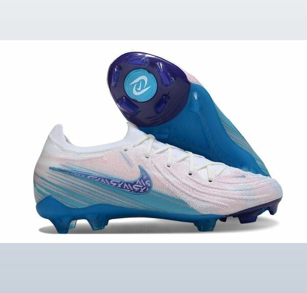 Nike blanches à semelle bleue/violette, accroche supérieure et style épuré.