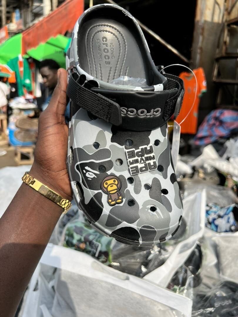 Chaussures Crocs confortables avec un design camouflage noir. Idéales pour les activités décontractées en extérieur.