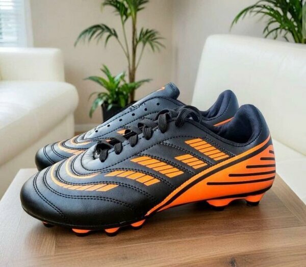 Chaussures de foot homme noires et orange, style moderne, idéales pour tous types de terrains. Semelle à crampons pour meilleure adhérence. Neuf.