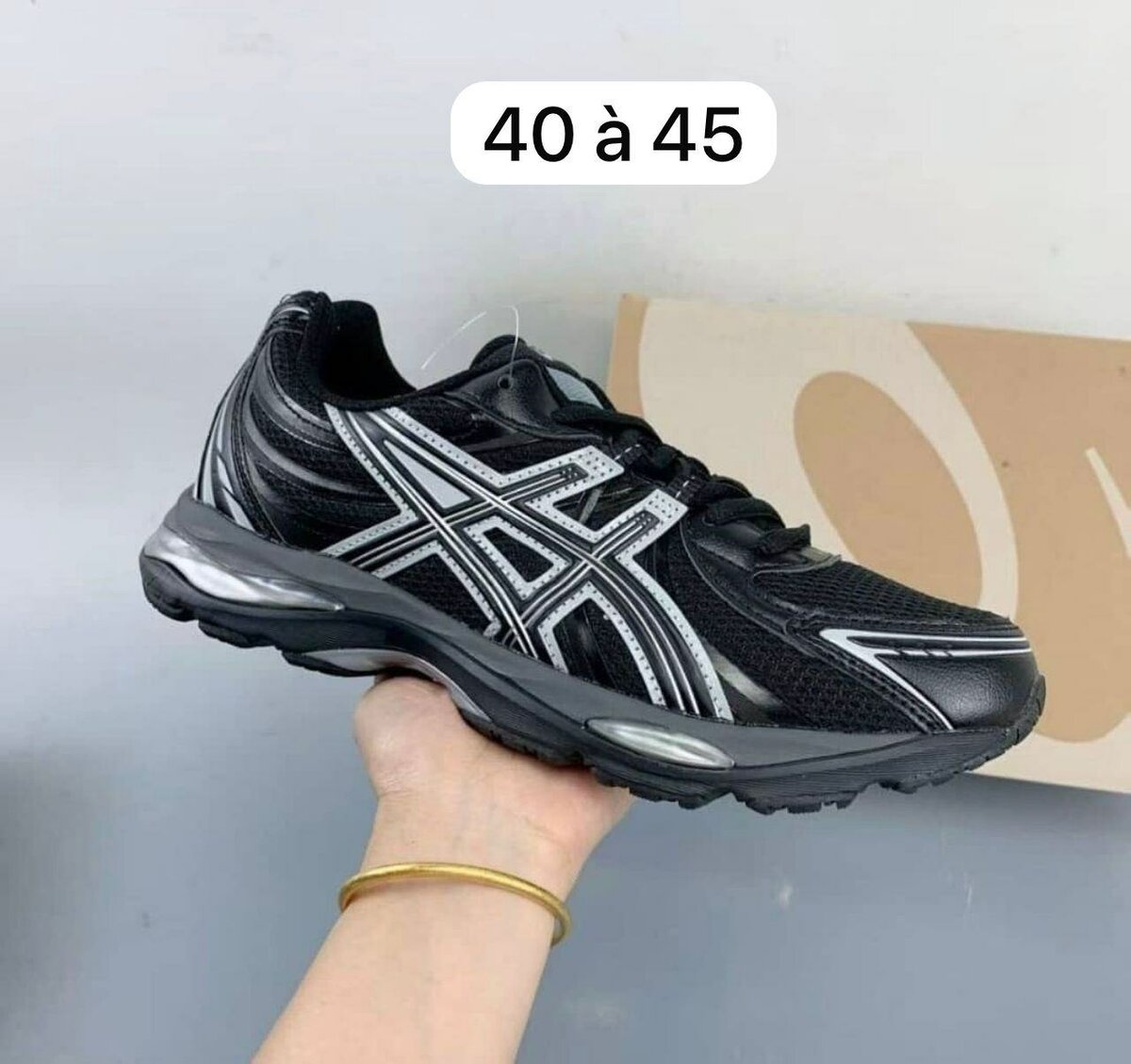 Découvrez ces chaussures de sport Asics noires et blanches, idéales pour le running et les activités sportives. Confortables et légères.