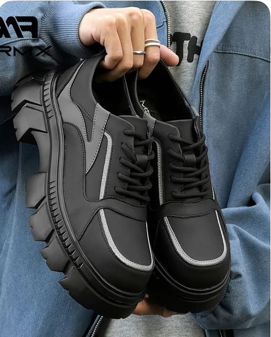 Chaussures homme en cuir noir avec semelles épaisses. Confortables et élégantes, idéales pour un usage quotidien ou décontracté.