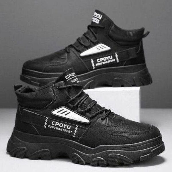 Découvrez ces chaussures montantes pour homme, alliant style et confort. Conçues en noir avec des accents blancs, elles sont idéales pour un look urbain et moderne. Parfaites pour les amateurs de mode streetwear.