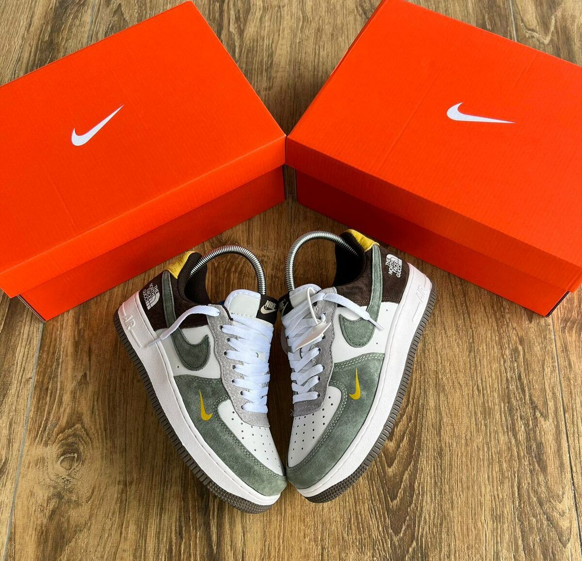 Découvrez les chaussures Nike Air Force 1 avec une combinaison de blanc et de vert. Conçues pour le confort et le style, ces baskets sont idéales pour les amateurs de mode streetwear. Disponibles avec leur boite d'origine.