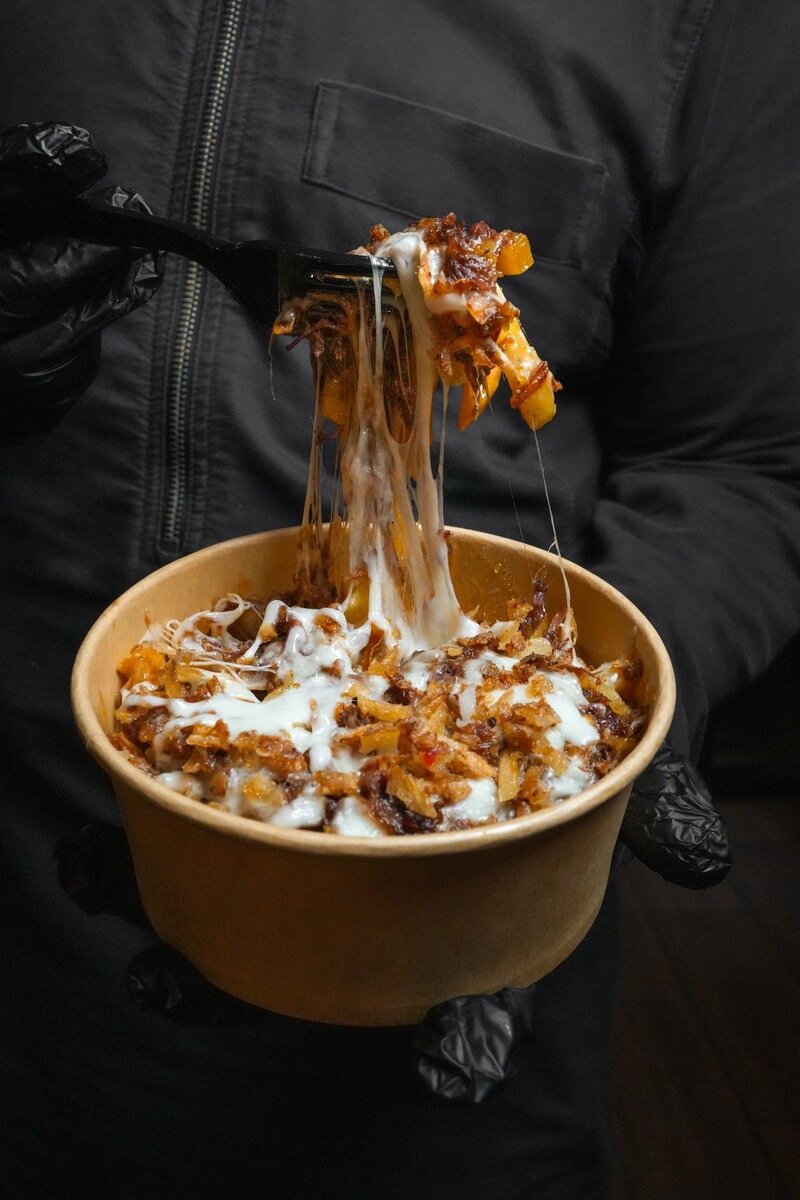 frites croustillantes généreusement recouvertes de viande hachée assaisonnée, nappées dune onctueuse sauce fromagère, puis finies avec une touche d'épices pour relever le tout.