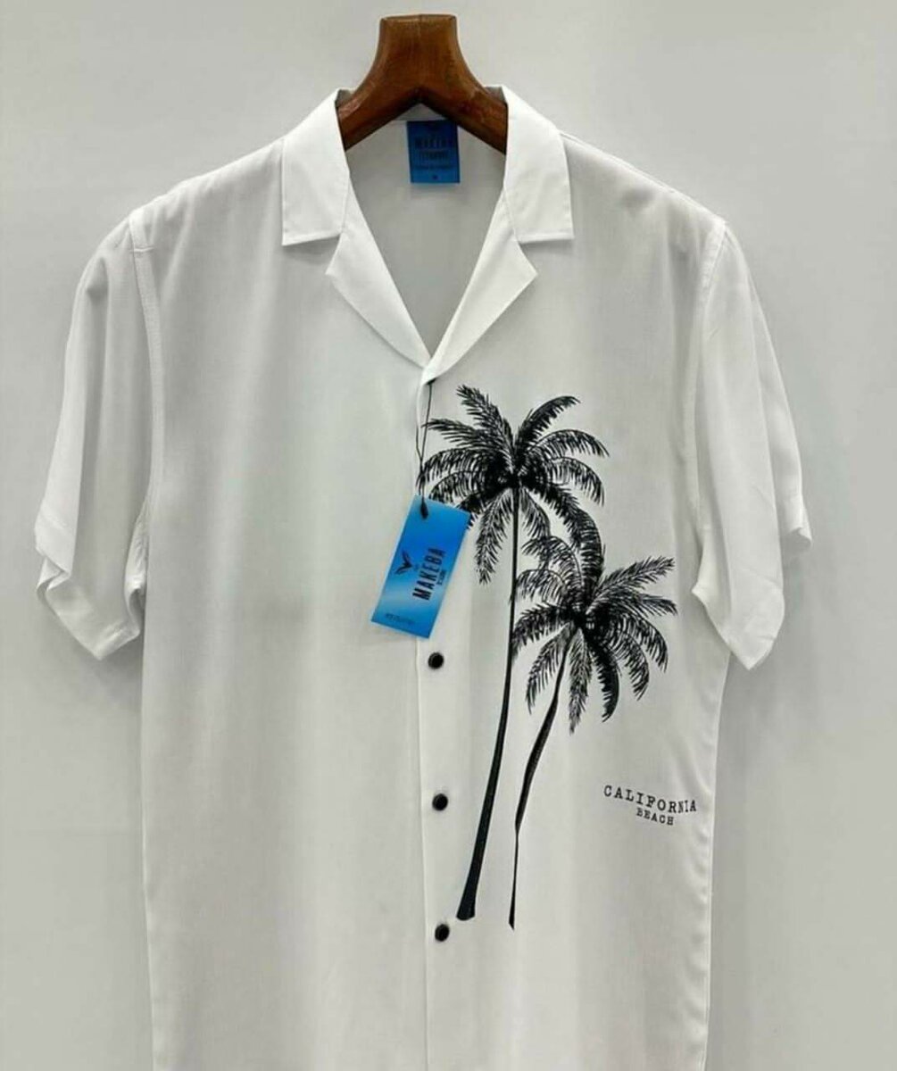 Élégante chemise blanche à manches courtes avec un design imprimé de palmiers. Parfait pour un look décontracté et estival. Confortable et légère, idéale pour les journées chaudes ou une sortie à la plage. Facile à assortir avec un pantalon ou un short.