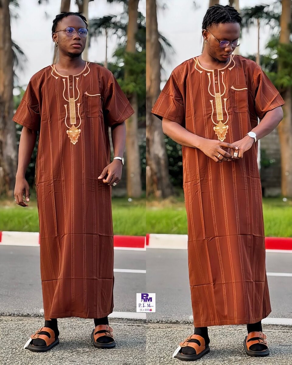 Chemise africaine marron avec broderie dorée pour homme, idéale pour les occasions spéciales ou le quotidien. Confortable et élégante.