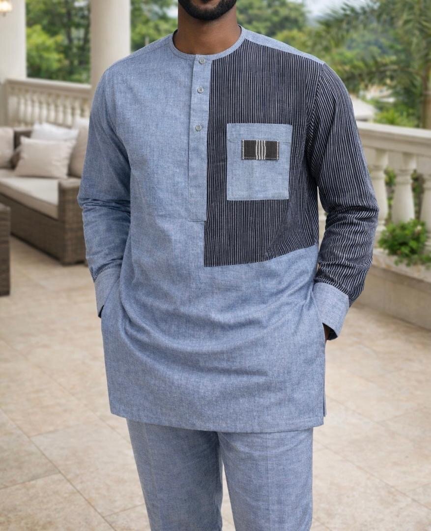 Chemise africaine pour homme, style moderne et élégant. Conçue pour les occasions spéciales ou décontractées. Tissu de qualité, coupe ajustée.
