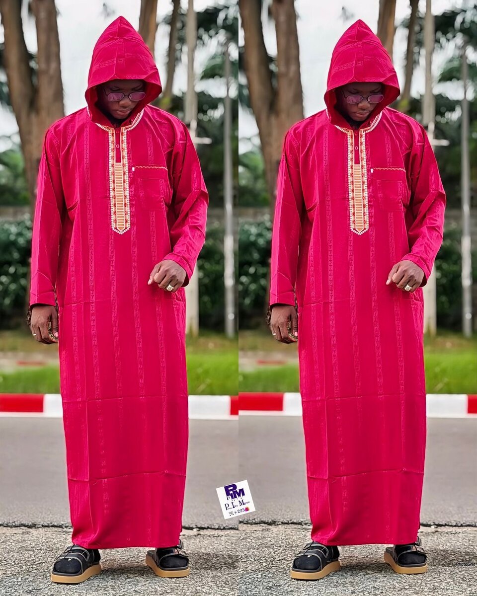 Chemise africaine rouge avec capuche et broderie dorée. Confortable et élégante pour les occasions spéciales.