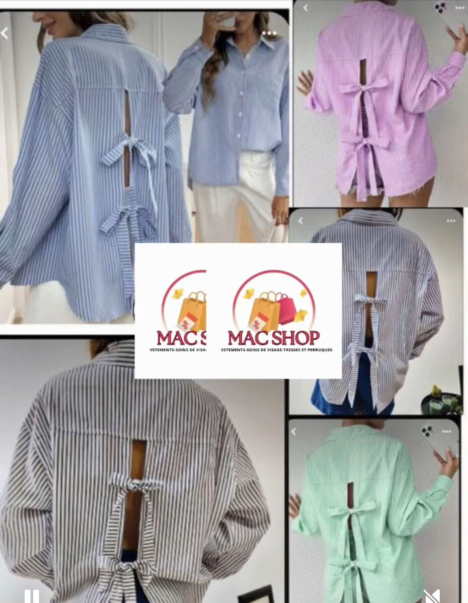 Chemise ample et confortable avec des rayures et des liens dans le dos. Disponible en plusieurs couleurs. Idéale pour un look décontracté et élégant.