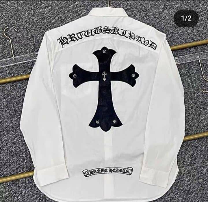 Chemise blanche élégante avec une croix noire au dos et des détails en noir. Conçue pour un style unique et moderne.